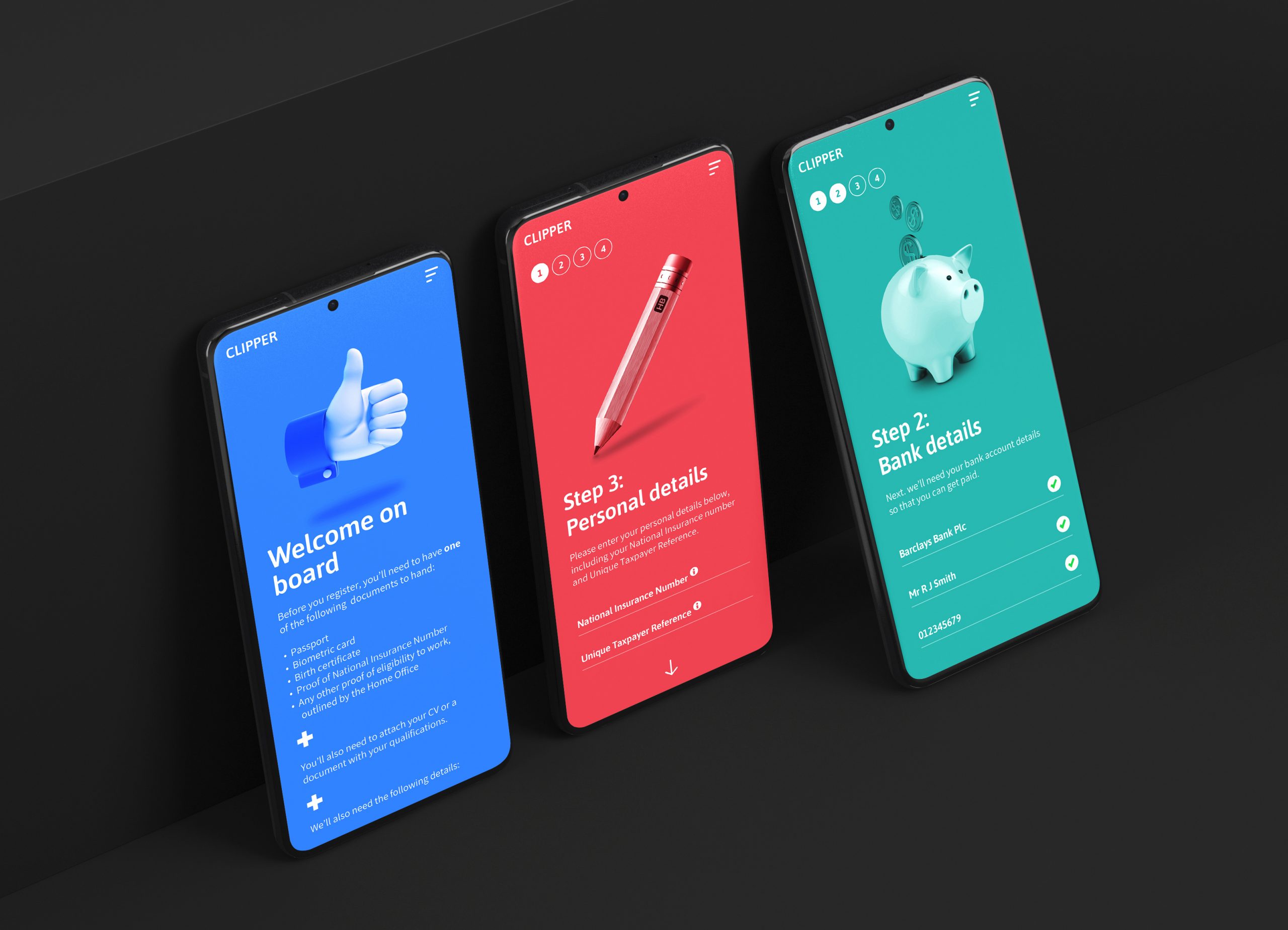Clipper Contracting Group Ltd provides payroll solutions and accountancy services to the recruitment sector and temporary workers. Clipper required a smartphone based ‘onboarding’ tool to make it easy for new employees to sign up with all the necessary details. We wanted to make the tool straight forward, intuitive and enjoyable to use. I broke the process down into manageable, easy-to-understand sections, whilst adding in funky bright colours and simple eye-catching images to counterbalance what would normally be a dry and lengthy process.