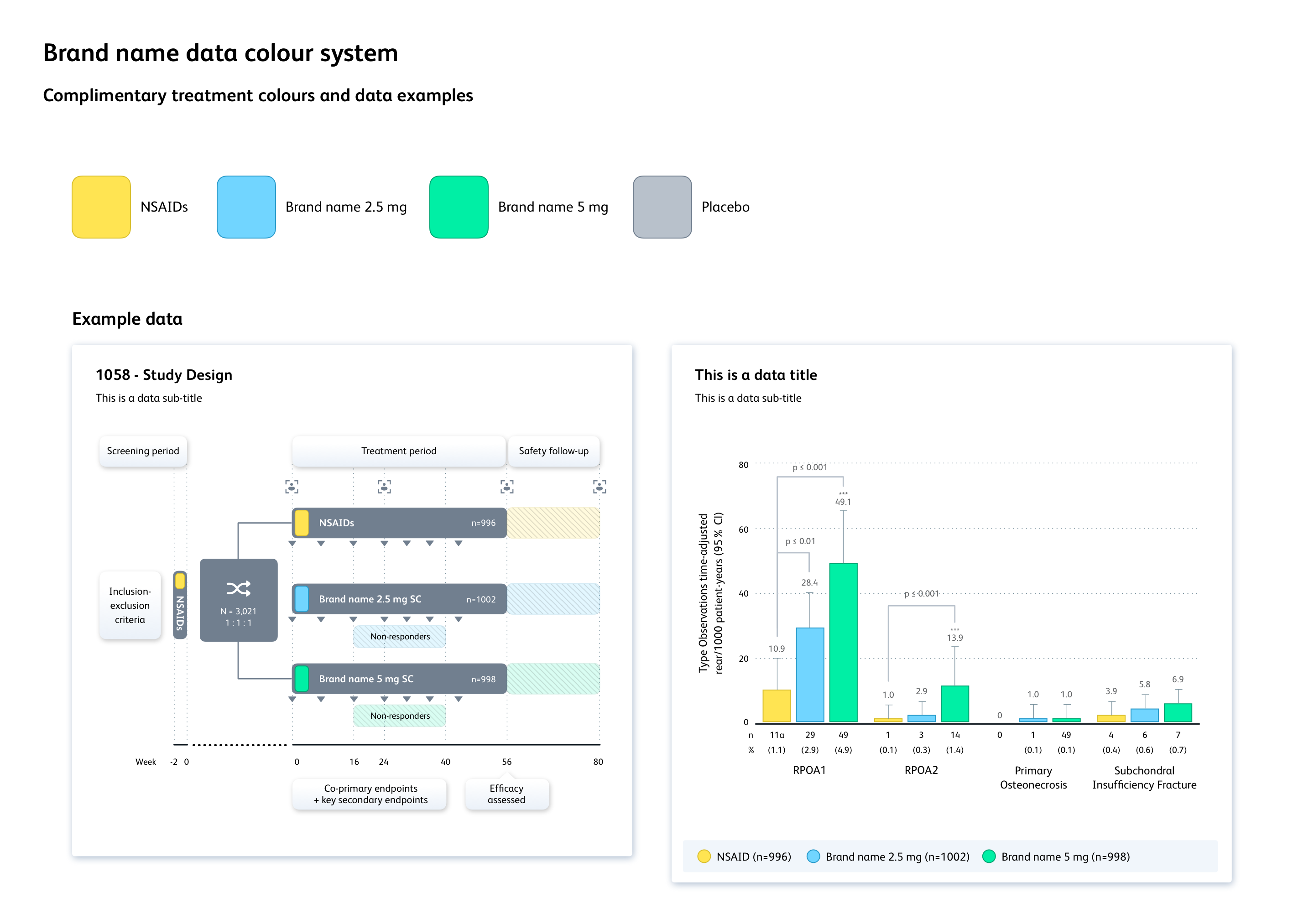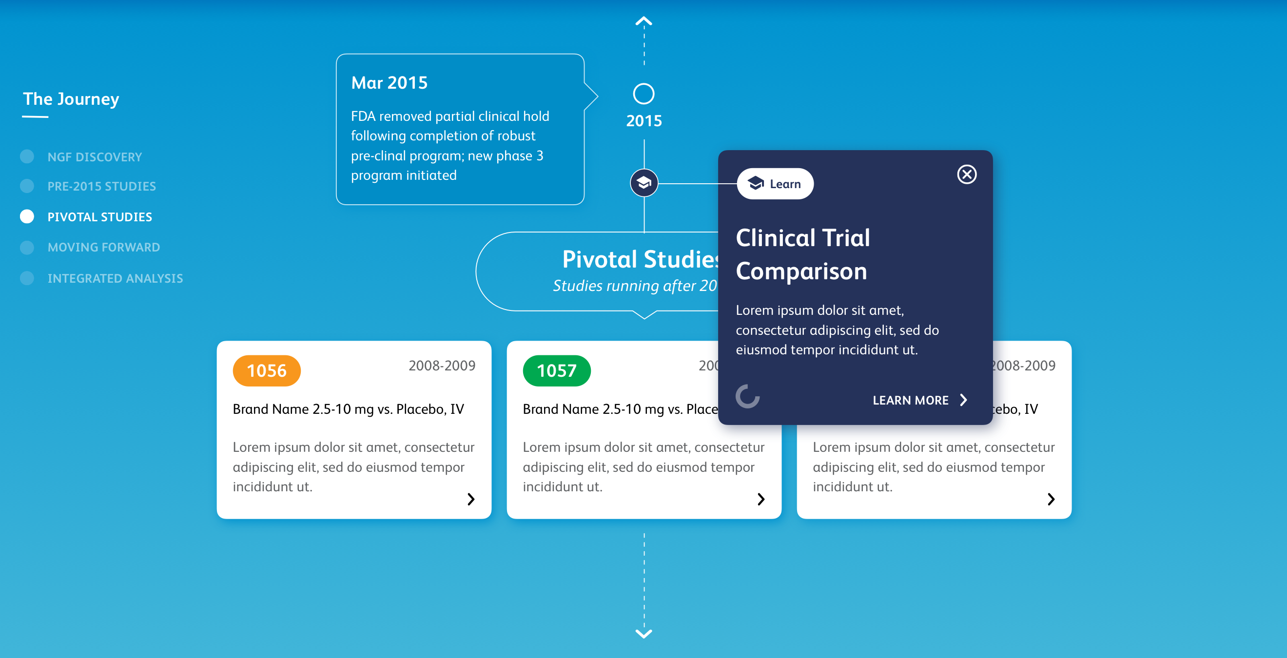 With no existing brand for the new drug, the visual design was built from the ground up—guided by global corporate brand standards. I created a full design system, including page templates, data visualisation styles, and an animated, interactive timeline.