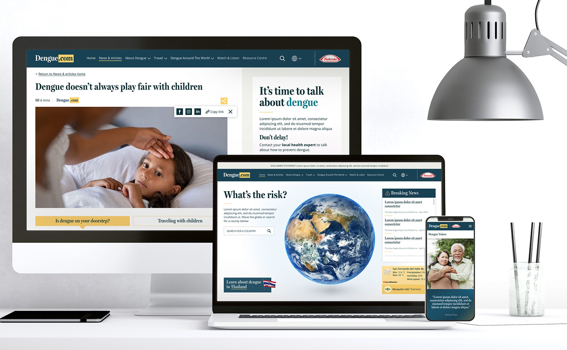 Created by the digital agency, Huumun, for Takeda, Dengue.com is a pioneering global initiative that seeks to inform everyone from the general public and healthcare professionals to key decision-makers in businesses and institutions about dengue risk, prevalence, and how to prevent it. To build trust and credibility, we modelled the site on major global news platforms like the BBC and Reuters, combining Takeda’s data with insights from respected sources such as the WHO and CDC.